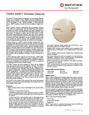 Datasheet for the Notifier FWSG, published in 2018. Document No: DN-60820, Rev: D. 21 models including FWSG, NFS2-3030, NFS2-640 and 18 additional variants. Detailed technical specifications, electrical ratings, and agency listings.