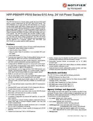 Datasheet for the Notifier HPF-PS6 and HPF-PS10, published in 2023. Document No: DN-61092, Rev: D. 21 models including HPF-PS6, HPF-PS10, HPF-PS6B and 18 additional variants. Detailed technical specifications, electrical ratings, and agency listings.