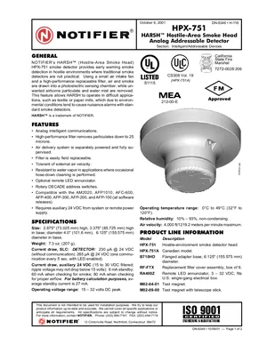 Datasheet for the Notifier HPX-751, published in 2001. Document No: DN-6346, Rev: H-116. 7 models including HPX-751, HPX-751A, B710HD and 4 additional variants. Product features, environmental operating limits, and compatibility data.