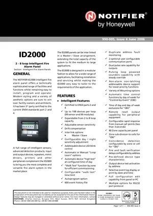 Datasheet for the Notifier ID2000, published in 2006. Document No: 990-005, Rev: Issue 4. 42 models including ID2000, 020-628, 020-469-009 and 39 additional variants. Product features, environmental operating limits, and compatibility data.