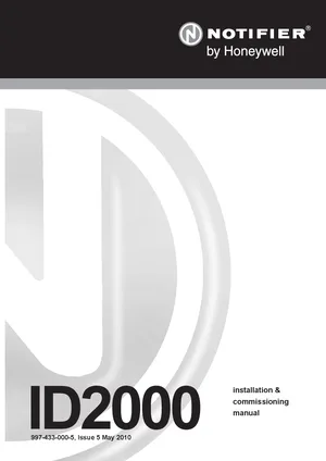 Installation Manual for the Notifier ID2000, published in 2010. Document No: 997-433-000-5, Rev: Issue 5. Models ID2000 and ID2002. Physical installation guide, backbox dimensions, and cabling specifications.