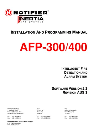 Installation and Programming Manual for the Notifier Inertia AFP-300/400, published in 2000. Rev: AUS 3. 31 models including AFP-300, AFP-400, B501 and 28 additional variants. Hardware mounting and wiring instructions alongside detailed system programming and configuration.