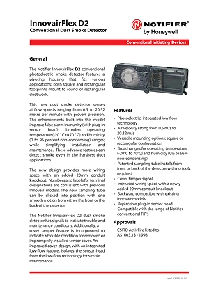 Datasheet for the Notifier InnovairFlex D2, published in 2009. Document No: DOC-02-099. Model InnovairFlex D2. Detailed technical specifications, electrical ratings, and agency listings.