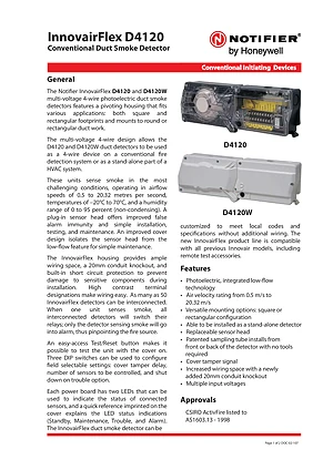 Datasheet for the Notifier InnovairFlex D4120, published in 2009. Document No: DOC-02-107. Models D4120 and D4120W. Product features, environmental operating limits, and compatibility data.