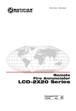 Installation, Operations, and Programming Manual for the Notifier LCD-2X20, published in 2000. Document No: 51105, Rev: B. 4 models including LCD-2X20, LCD-2X20L, LDC-20 and 1 additional variants. Hardware installation, alarm/fault management, and advanced system configuration.
