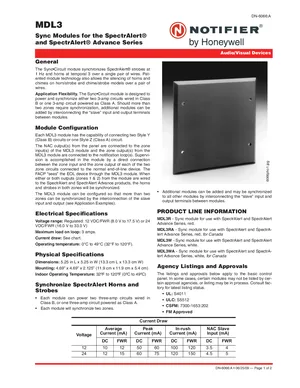 Datasheet for the Notifier MDL3, published in 2009. Document No: DN-6066, Rev: A. 5 models including MDL3, MDL3R, MDL3RA and 2 additional variants. Engineering specifications, wiring diagrams, and mounting dimensions.