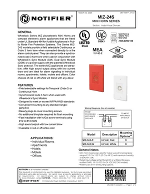 Datasheet for the Notifier MIZ-24S Series, published in 2004. Document No: DN-4587. Models MIZ-24S, MIZ-24S-R and MIZ-24S-W. Engineering specifications, wiring diagrams, and mounting dimensions.