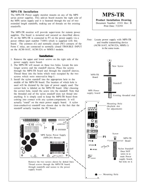 Installation Manual for the Notifier MPS-TR, published in 1993. Document No: 15331, Rev: B. 14 models including MPS-TR, MPS-24A, MPS-24B and 11 additional variants. Mounting instructions, wiring diagrams, and system power-up procedures.