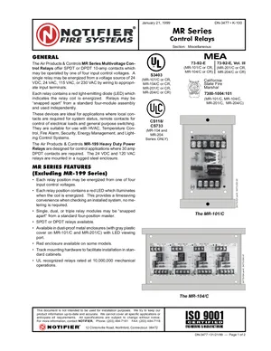 Datasheet for the Notifier MR Series Control Relays, published in 1999. Document No: DN-3477, Rev: K-100. 16 models including MR-101/T, MR-101/C, MR-101/CR and 13 additional variants. Product features, environmental operating limits, and compatibility data.
