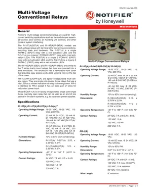 Datasheet for the Notifier Multi-Voltage Conventional Relays, published in 2013. Document No: DN-7015, Rev: A2. 12 models including R-10T, R-14T, R-20T and 9 additional variants. Engineering specifications, wiring diagrams, and mounting dimensions.