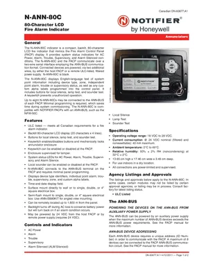 Datasheet for the Notifier N-ANN-80C, published in 2011. Document No: DN-60677, Rev: A1. 5 models including N-ANN-80C, ANN-SB80KIT, ANN-SB80KIT-B and 2 additional variants. Detailed technical specifications, electrical ratings, and agency listings.