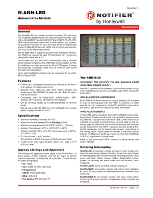Datasheet for the Notifier N-ANN-LED, published in 2014. Document No: DN-60242, Rev: D. 10 models including N-ANN-LED, N-ANN-RLED, N-ANN-LED-R and 7 additional variants. Detailed technical specifications, electrical ratings, and agency listings.
