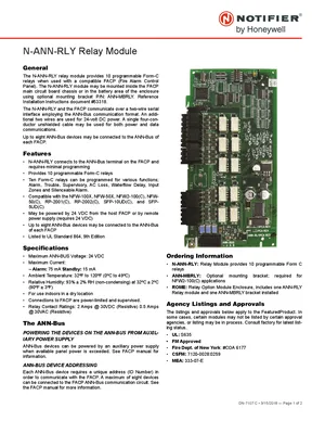 Datasheet for the Notifier N-ANN-RLY, published in 2018. Document No: DN-7107, Rev: C. 17 models including N-ANN-RLY, ANN-MBRLY, ROME and 14 additional variants. Product features, environmental operating limits, and compatibility data.