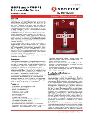 Datasheet for the Notifier N-MPS and NFW-MPS (Canadian), published in 2010. Document No: DN-60629, Rev: A1. 21 models including N-MPS-SA, NFW-MPS-SA, N-MPS-SAC and 18 additional variants. Detailed technical specifications, electrical ratings, and agency listings.