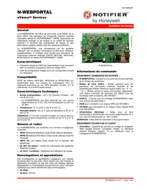 Datasheet for the Notifier N-WEBPORTAL (French), published in 2017. Document No: DN-60806, Rev: B. 8 models including N-WEBPORTAL, NFS-320, NFS2-640 and 5 additional variants. Engineering specifications, wiring diagrams, and mounting dimensions.