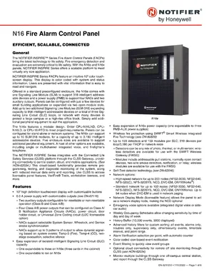 Datasheet for the Notifier N16, published in 2022. Document No: DN-62112, Rev: E. 136 models including N16, N16e, N16x and 133 additional variants. Product features, environmental operating limits, and compatibility data.