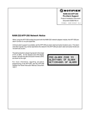 Installation Manual for the Notifier NAM-232/AFP-200 Pre-Alarm Support, published in 1995. Document No: 50383, Rev: A. Models NAM-232 and AFP-200. Mounting instructions, wiring diagrams, and system power-up procedures.