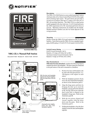 Installation Manual for the Notifier NBG-12LA, published in 2001. Document No: 51300, Rev: A1. Model NBG-12LA. Hardware installation, terminal connections, and environmental requirements.