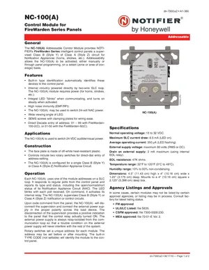 Datasheet for the Notifier NC-100, published in 2010. Document No: dn-7000, Rev: a2. 8 models including NC-100, SMB500, CB500 and 5 additional variants. Detailed technical specifications, electrical ratings, and agency listings.