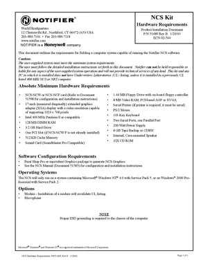 Installation Manual for the Notifier NCS Kit Hardware Requirements, published in 2003. Document No: 51689, Rev: B. 5 models including NCS Kit, NCS, NCS-NCW and 2 additional variants. Hardware installation, terminal connections, and environmental requirements.