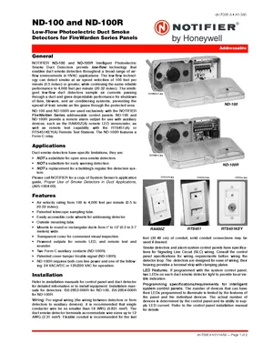 Datasheet for the Notifier ND-100 and ND-100R, published in 2009. Document No: dn-7006, Rev: A. 19 models including ND-100, ND-100R, RA400Z and 16 additional variants. Product features, environmental operating limits, and compatibility data.