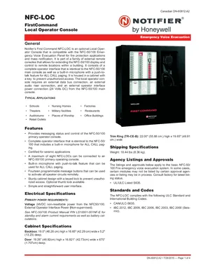 Datasheet for the Notifier NFC-LOC (Canadian), published in 2015. Document No: DN-60812, Rev: A2. 13 models including NFC-LOC, NFC-50/100, NFC-BDA-25V and 10 additional variants. Detailed technical specifications, electrical ratings, and agency listings.