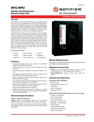 Datasheet for the Notifier NFC-RPU, published in 2015. Document No: DN-60775, Rev: C. 16 models including NFC-RPU, NFC-50/100, NFC-50/100E and 13 additional variants. Product features, environmental operating limits, and compatibility data.