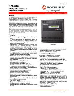 Datasheet for the Notifier NFS-320, published in 2007. Document No: DN-7112, Rev: A-14. 84 models including NFS-320, NFS-320C, NFS-320E and 81 additional variants. Product features, environmental operating limits, and compatibility data.