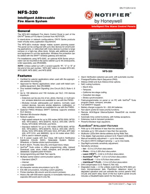 Datasheet for the Notifier NFS-320, published in 2017. Document No: DN-7112, Rev: N. 124 models including NFS-320, NFS-320R, NFS-320C and 121 additional variants. Product features, environmental operating limits, and compatibility data.