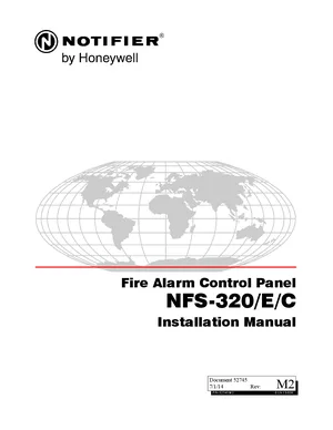 Installation Manual for the Notifier NFS-320, published in 2014. Document No: 52745, Rev: M2. 178 models including NFS-320, NFS-320E, NFS-320C and 175 additional variants. Hardware installation, terminal connections, and environmental requirements.