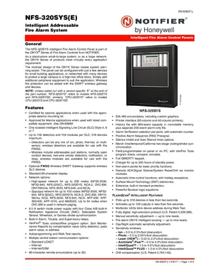 Datasheet for the Notifier NFS-320SYS, published in 2017. Document No: DN-60637, Rev: L. 72 models including NFS-320SYS, NFS-320SYSE, CPU-320SYS and 69 additional variants. Detailed technical specifications, electrical ratings, and agency listings.