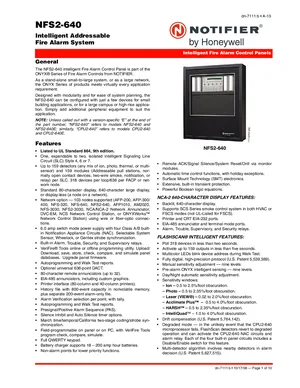 Datasheet for the Notifier NFS2-640, published in 2008. Document No: dn-7111, Rev: b. 53 models including NFS2-640, NFS2-640E, CPU2-640 and 50 additional variants. Product features, environmental operating limits, and compatibility data.