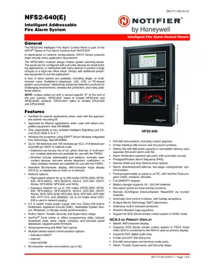 Datasheet for the Notifier NFS2-640, published in 2017. Document No: DN-7111, Rev: M. 207 models including NFS2-640, NFS2-640E, CPU2-640 and 204 additional variants. Detailed technical specifications, electrical ratings, and agency listings.