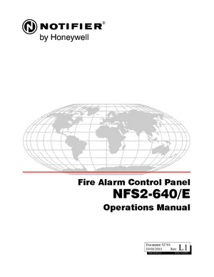 Operations Manual for the Notifier NFS2-640, published in 2013. Document No: 52743, Rev: L1. Models NFS2-640 and NFS2-640E. User interface controls, event handling, and routine maintenance tasks.