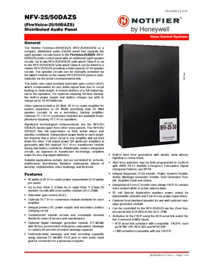 Datasheet for the Notifier NFV-25/50DAZS Distributed Audio Panel, published in 2010. Document No: DN-60049, Rev: b. 17 models including NFV-25/50DAZS, FireVoice-25/50DAZS, NFV-25/50ZS and 14 additional variants. Detailed technical specifications, electrical ratings, and agency listings.