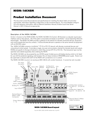 Installation Manual for the Notifier NION-16C48M, published in 1999. Document No: 50816, Rev: B. 7 models including NION-16C48M, NION-2C8M, MPS24BRB and 4 additional variants. Physical installation guide, backbox dimensions, and cabling specifications.