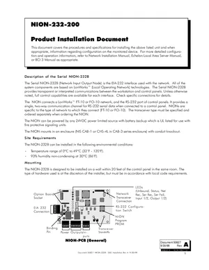 Installation Manual for the Notifier NION-232-200, published in 1998. Document No: 50827, Rev: A. Models NION-232-200, NION-232B and NION-200. Physical installation guide, backbox dimensions, and cabling specifications.
