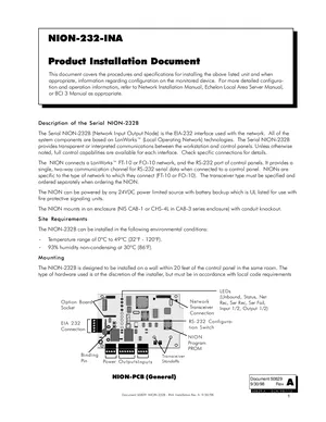 Installation Manual for the Notifier NION-232-INA, published in 1998. Document No: 50829, Rev: A. Models NION-232-INA, NION-232B and NION-INA. Physical installation guide, backbox dimensions, and cabling specifications.