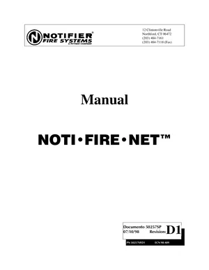 Manual for the Notifier NOTI-FIRE-NET, published in 1998. Document No: 50257SP, Rev: D1. 58 models including NOTI-FIRE-NET, AM2020, AFP1010 and 55 additional variants. Capabilities, specifications summary, and usage notes.