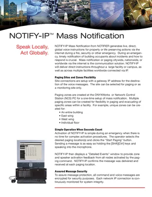 Brochure for the Notifier NOTIFY-IP, published in 2005. Document No: M-SS-NOTIP, Rev: 03/03/05. 5 models including NOTIFY-IP, ONYXWorks, NCS and 2 additional variants. Product highlights, key features, and application overview.