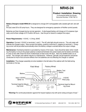 Installation and Wiring Diagram for the Notifier NR45-24. Document No: 15760, Rev: B. Model NR45-24. Mounting instructions, terminal connections, and system wiring layouts.
