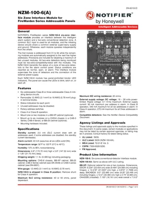 Datasheet for the Notifier NZM-100-6, published in 2013. Document No: DN-60150, Rev: D. 5 models including NZM-100-6, NZM-100-6A, BB-XP and 2 additional variants. Detailed technical specifications, electrical ratings, and agency listings.