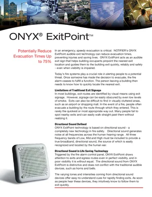 Brochure for the Notifier ONYX ExitPoint, published in 2005. Document No: M-SS-ONYXEP, Rev: 02/24/05. Model ONYX ExitPoint. Product lineup, feature summary, and deployment scenarios.