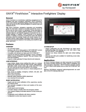 Datasheet for the Notifier ONYX FirstVision, published in 2021. Document No: DN-7051, Rev: G. 12 models including FIRSTVISION-LCD, FIRSTVISION-ENC, FIRSTVISION-SCT and 9 additional variants. Engineering specifications, wiring diagrams, and mounting dimensions.