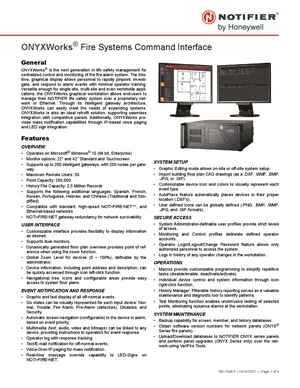 Datasheet for the Notifier ONYXWorks, published in 2021. Document No: DN-7048, Rev: P. 20 models including ONYXWorks, NFN-GW-EM-3, ONYXWORKS-W and 17 additional variants. Product features, environmental operating limits, and compatibility data.