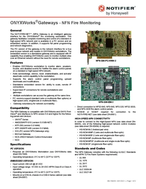 Datasheet for the Notifier ONYXWorks Gateways, published in 2021. Document No: DN-7060, Rev: B. 6 models including NFN-GW-PC-HNW-2, NFN-GW-EM-3, NFN-GW-PC-W and 3 additional variants. Product features, environmental operating limits, and compatibility data.
