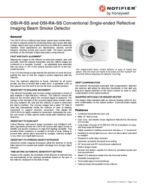 Datasheet for the Notifier OSI-R-SS and OSI-RA-SS, published in 2019. Document No: DN-61073, Rev: B. 9 models including OSI-R-SS, OSI-RA-SS, OSP-002 and 6 additional variants. Product features, environmental operating limits, and compatibility data.