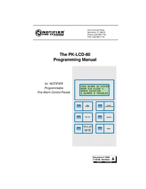 Programming Manual for the Notifier PK-LCD-80, published in 1999. Document No: 15658, Rev: A. 11 models including PK-LCD-80, LCD-80, PK-1 and 8 additional variants. System configuration, zone programming, and cause-and-effect logic.
