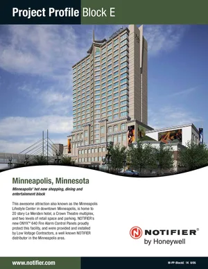 Brochure for the Notifier Project Profile Block E, published in 2005. Document No: M-PP-BlockE. Model ONYX 640. Product lineup, feature summary, and deployment scenarios.