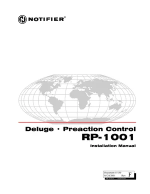 Installation Manual for the Notifier RP-1001, published in 2001. Document No: 15150, Rev: F. 13 models including RP-1001, RP-1001E, RP-1001C and 10 additional variants. Mounting instructions, wiring diagrams, and system power-up procedures.